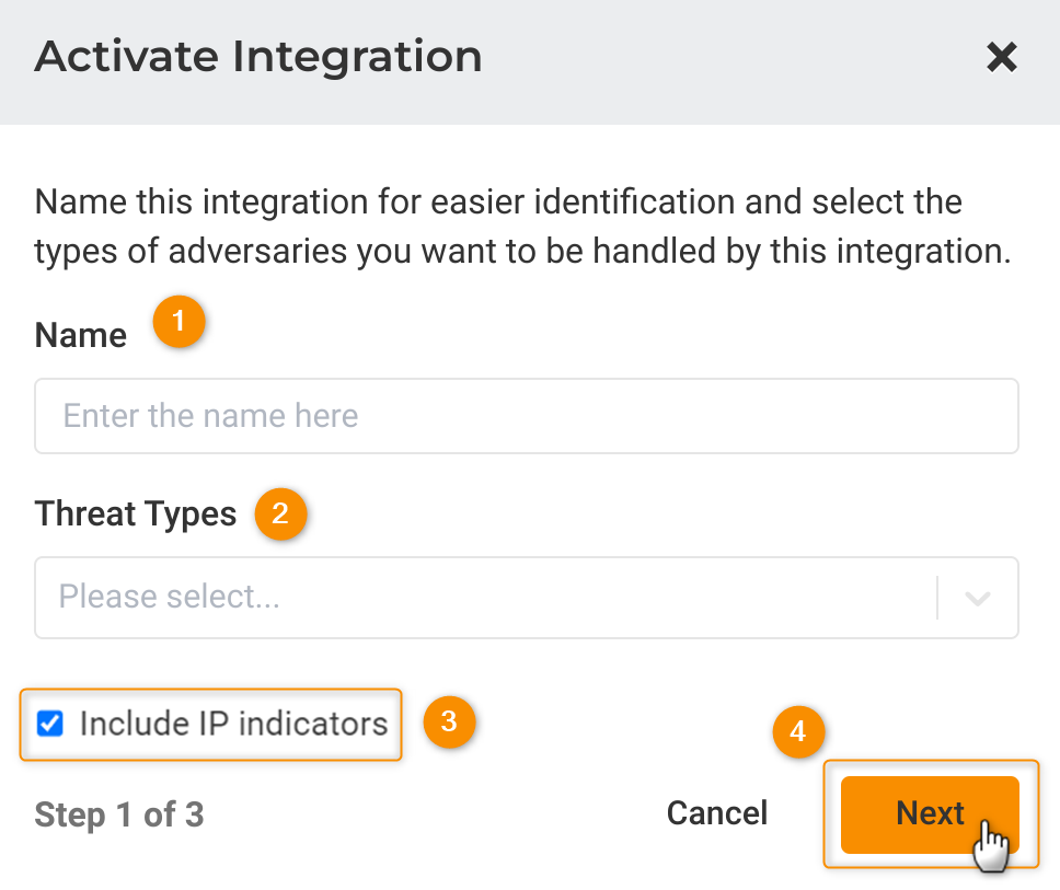 4. A popup will appear asking you to fill in Name and Threat Types. Make sure the name of the integration is meaningful and descriptive, and then choose the Threat Types you want the integration to push to Infoblox Threat Defense. If you want to include IP addresses in your Infoblox custom list, click the Include IP Indicators tickbox to do so.