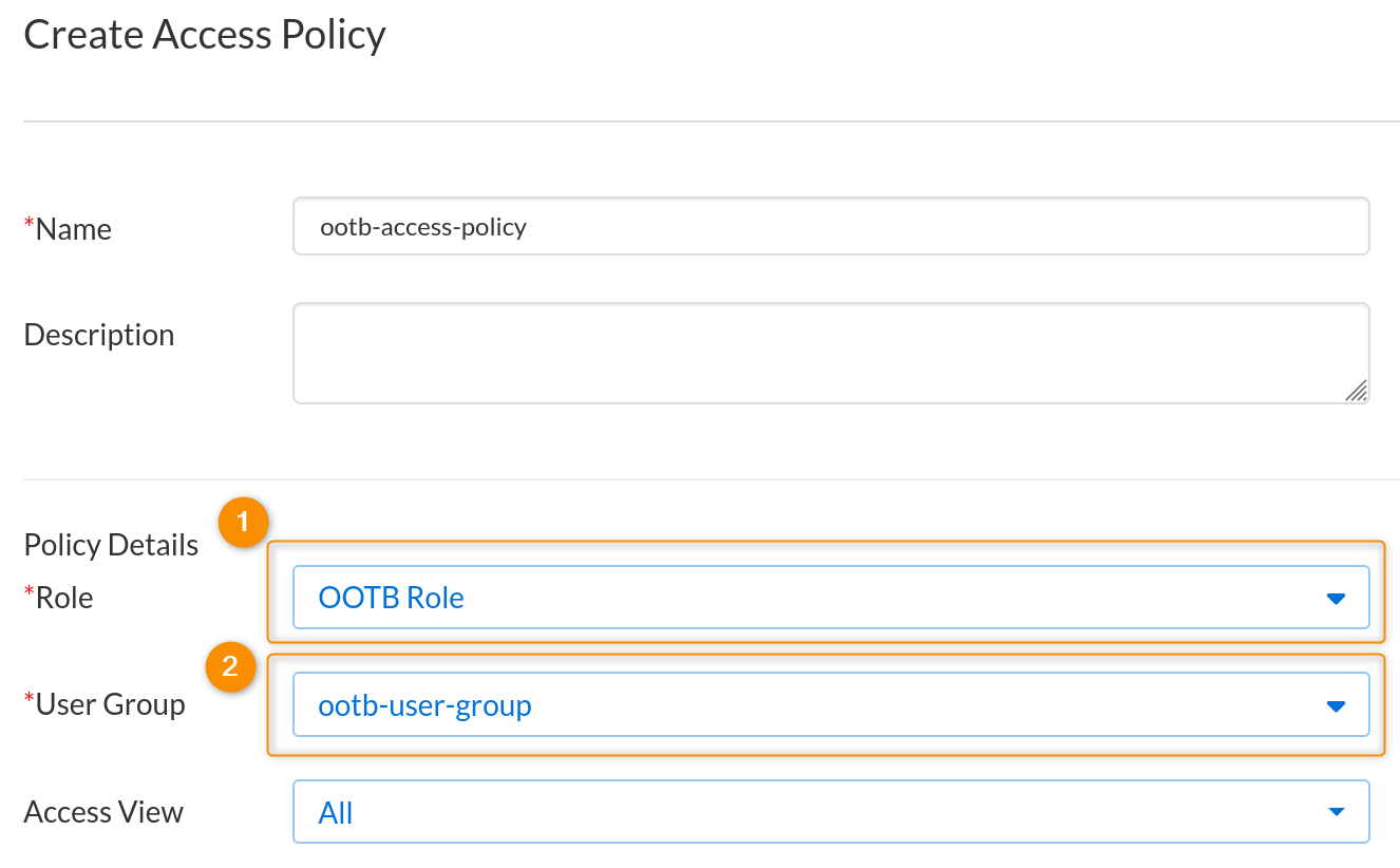 12. This will open the Access Policy creation dialog box. First, enter an identifiable name for the policy, and a detailed description (optional). Now, the most vital part of the procedure is to select the integration Role and User Group from the corresponding drop-down menus. Access View is set to All by default, leave it as is.
