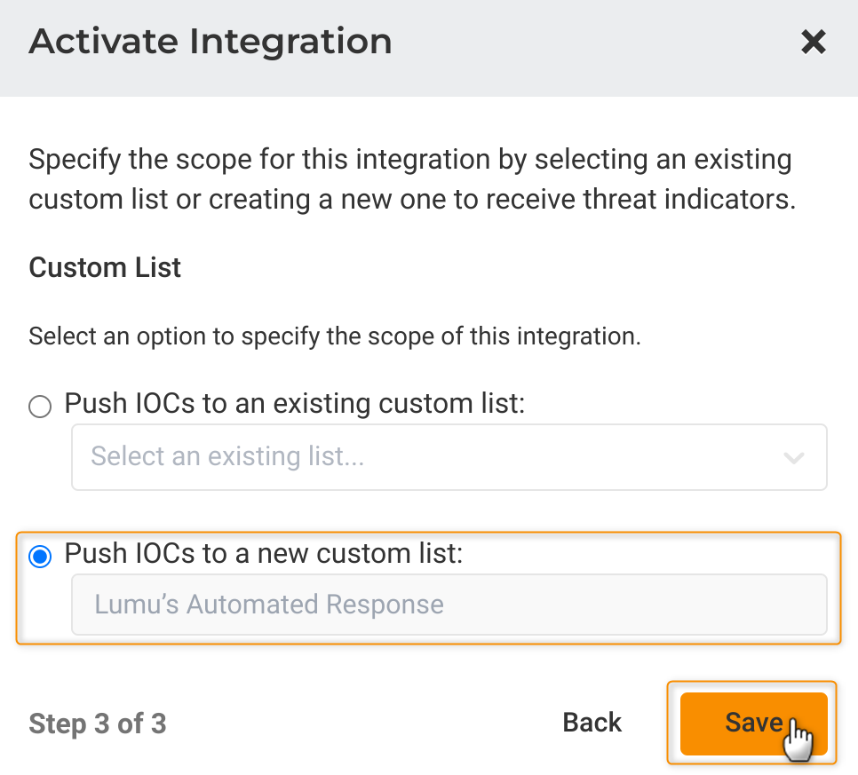 6. Finally, you will be asked to select a Custom List to which the threat indicators will be sent. You can choose an existing one using the Push IOCs to an existing custom list dropdown, or create a new one using the Push IOCs to a new custom list text field. Lumu provides a recommended name for this list, but you can change it to whatever best suits your needs. For the purposes of this guide, we will select the Push IOCs to a new custom list option. Once done, click Save.