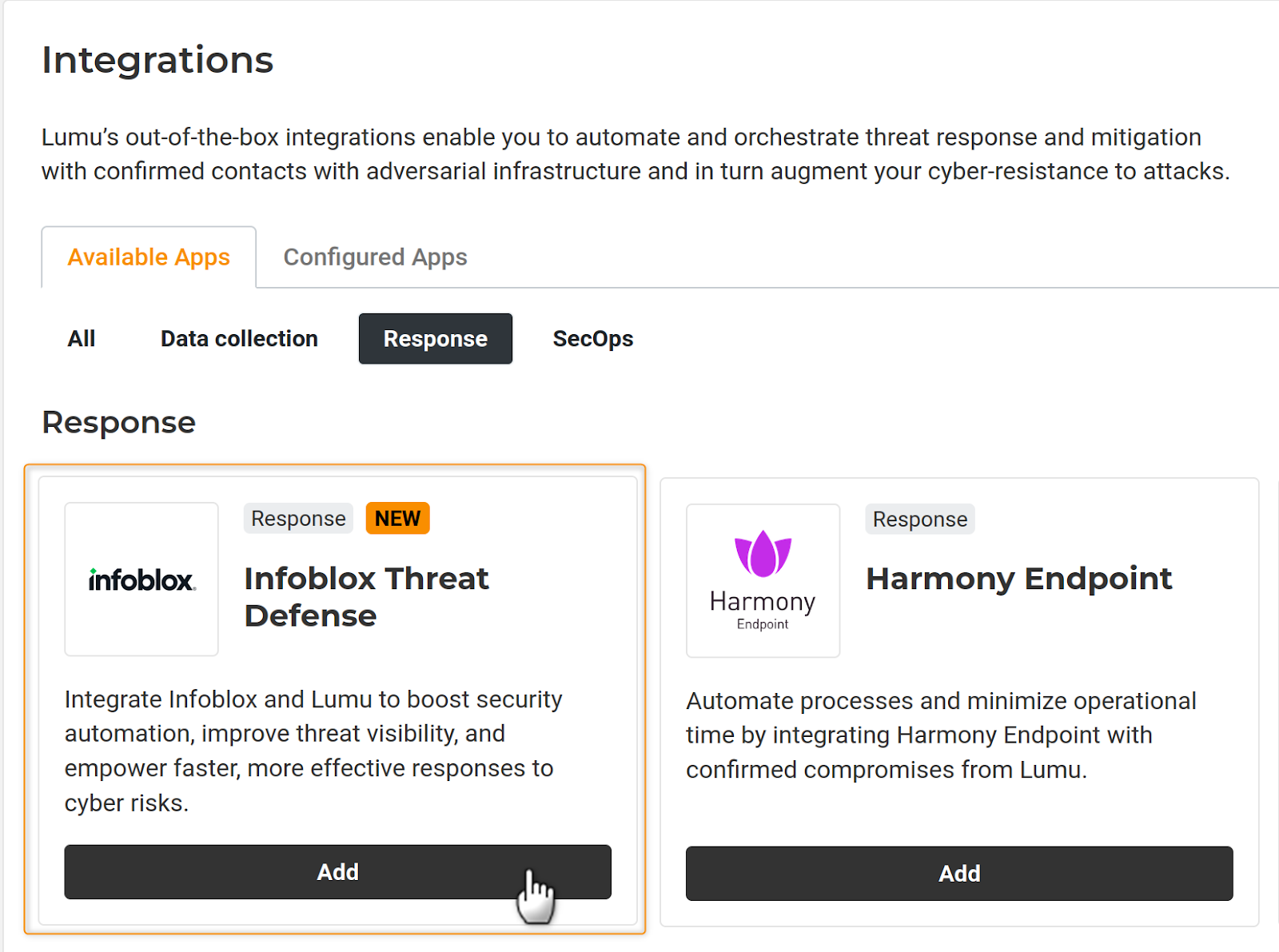 1. In the Lumu Portal, head to the panel on the left and open the Integrations dropdown menu. Then, click on Apps. Click on the Response tab on the right to filter the available integrations accordingly.