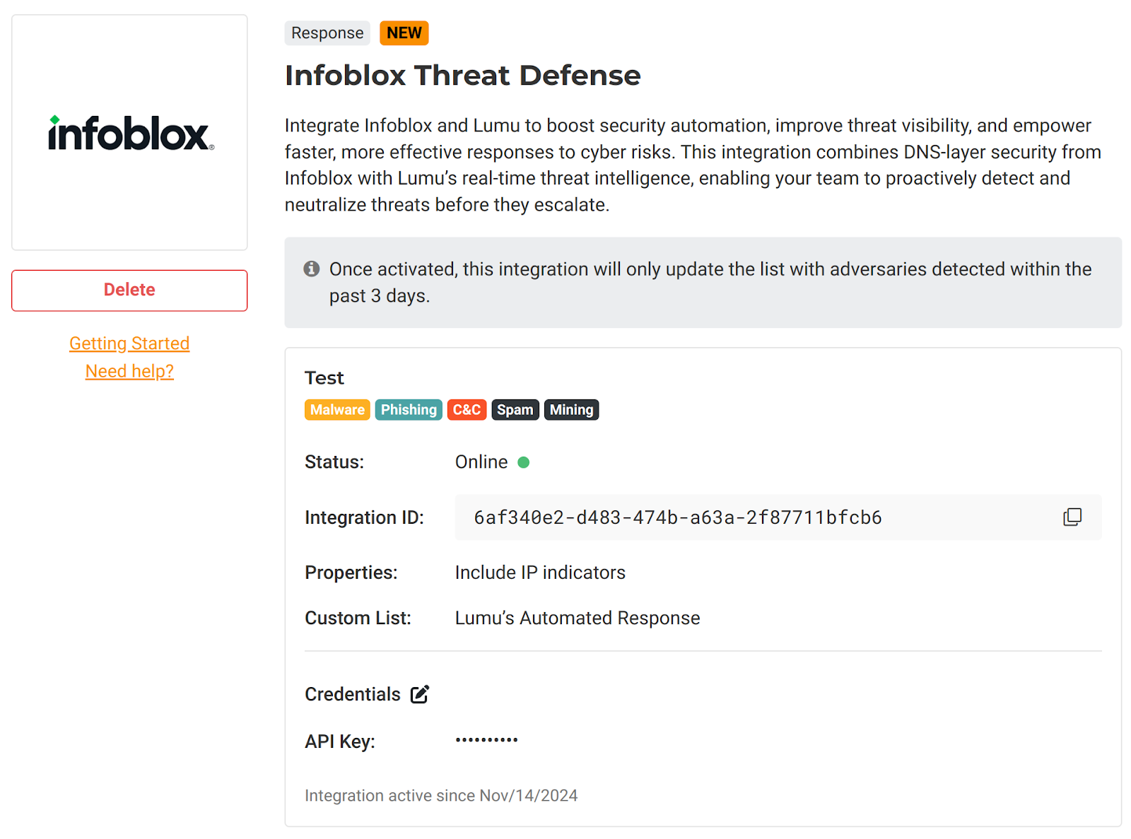 7. The integration is now created and active. The Lumu Portal will display the details of the created integration.