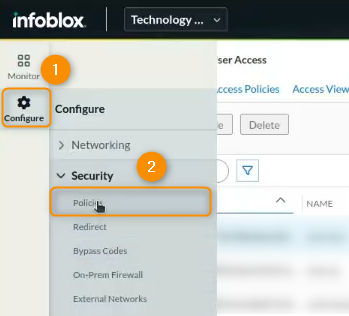 1. In your Infoblox Threat Defense Portal, select the Configure menu on the left panel, go to Security, and open the Policies panel.