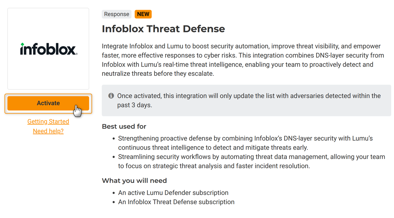 This article describes the required procedure to integrate Infoblox Threat Defense with Lumu for automated response procedures. This is one of our featured Out-of-the-Box Response Integrations. Requirements