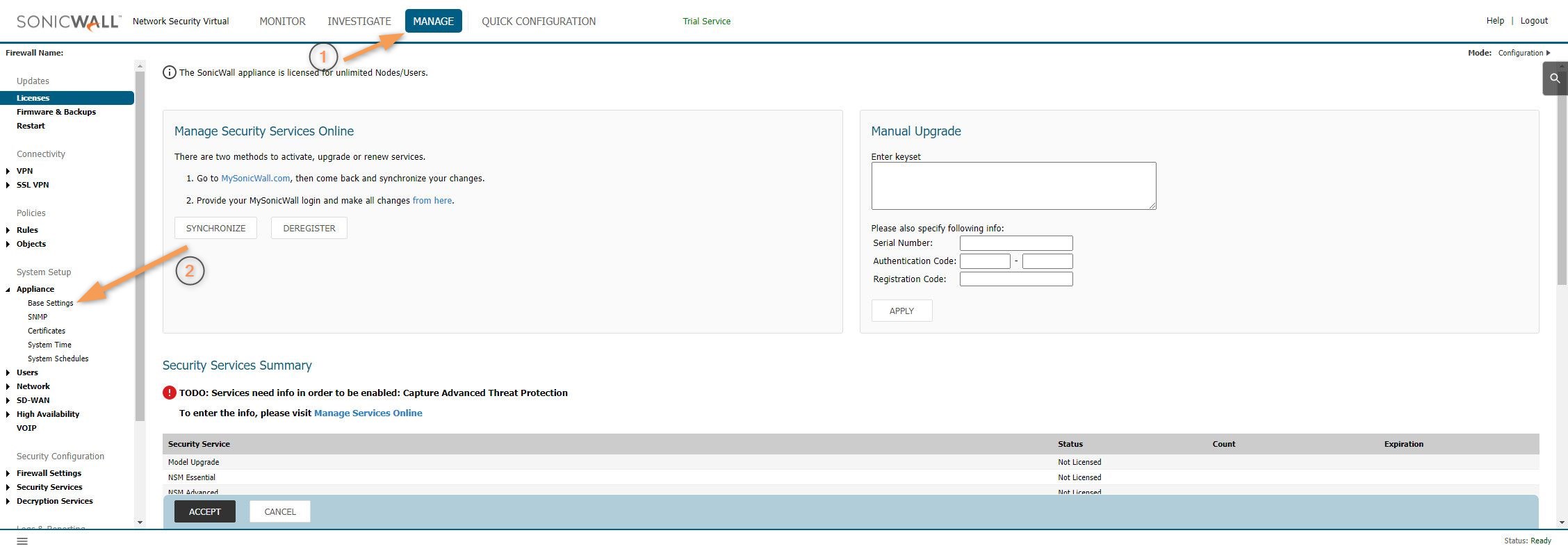 In the top navigation bar click on Manage. In the left navigation bar click on Appliance and in the options that are displayed select Base Settings.