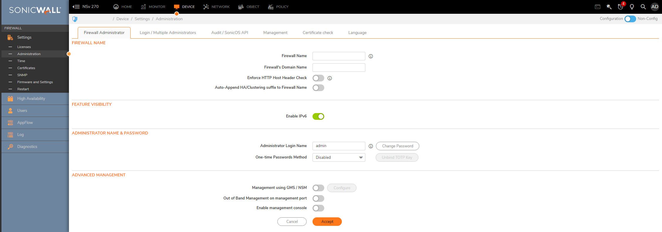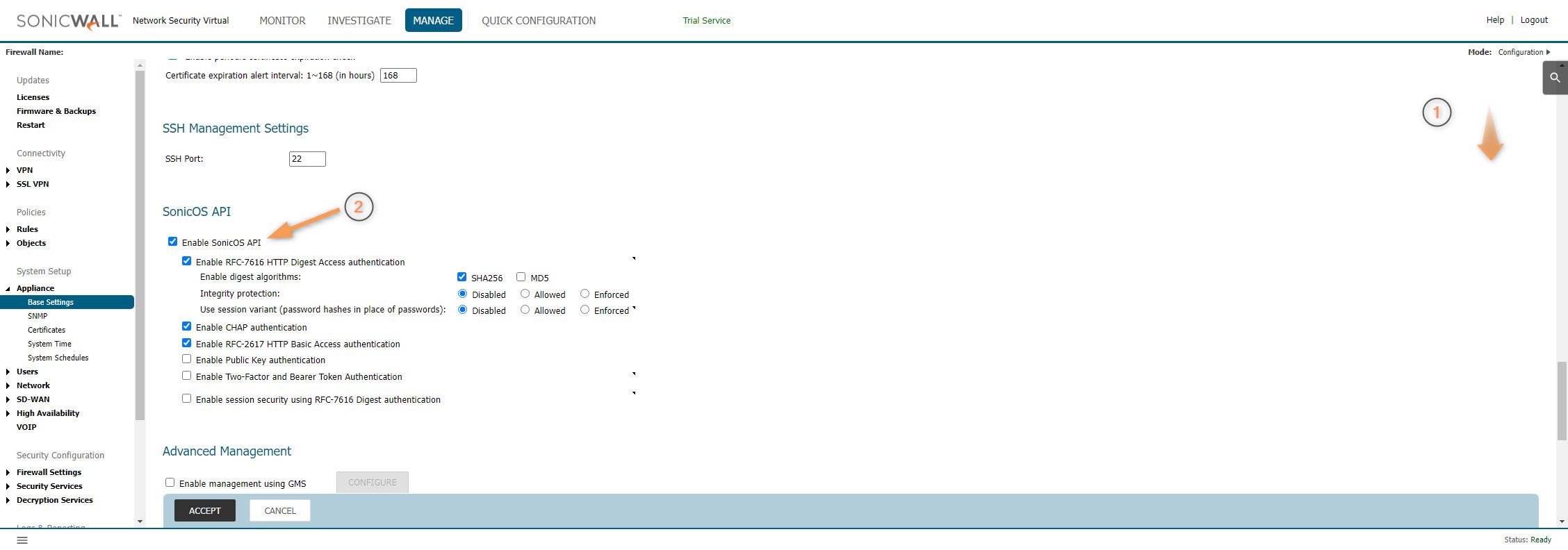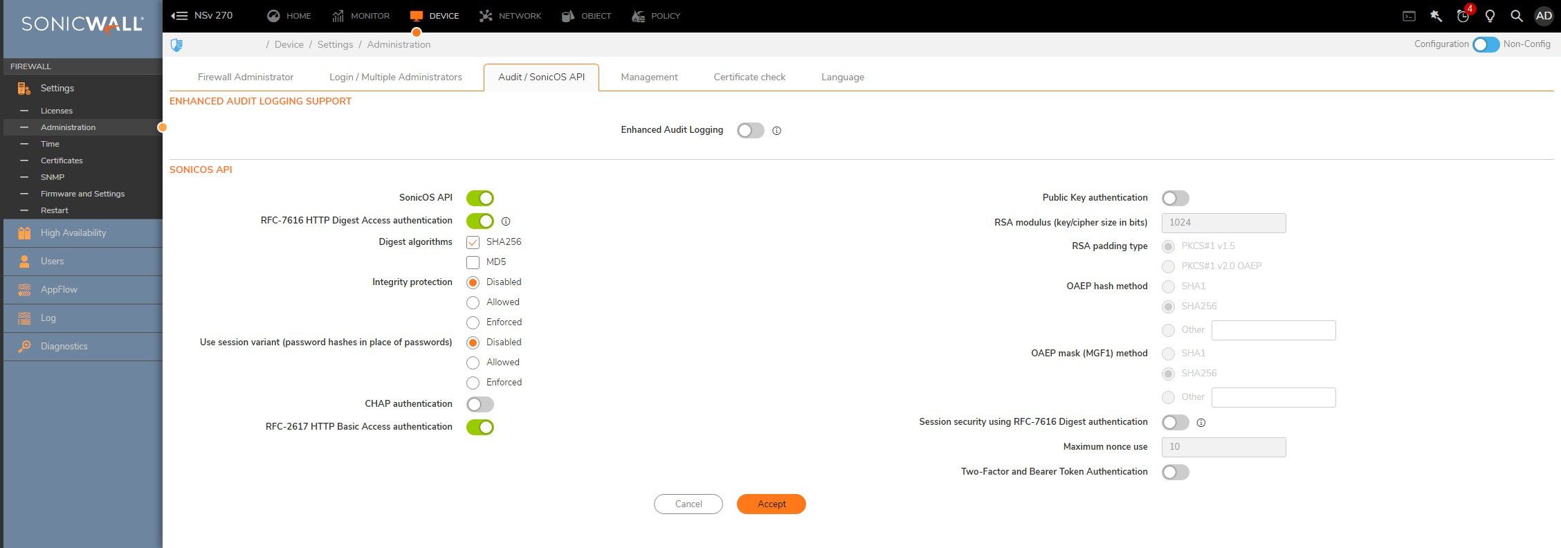 On the page that opens, scroll down and search for SonicOS API, once you have found it, check the Enable SonicOS API box and select the authentication method(s), we suggest leaving the configuration as it is in the image example below. Now click on Accept.