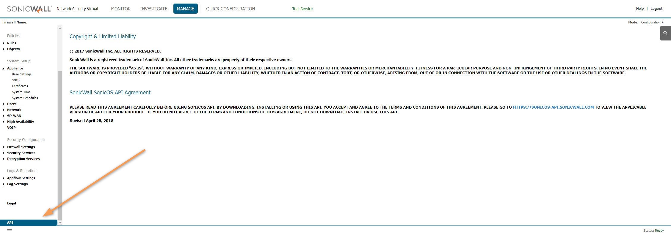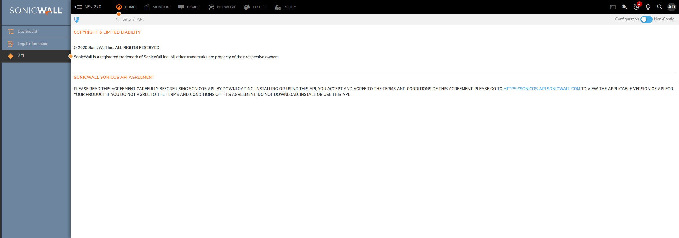 In the top navigation bar click on Home, then in the left navigation bar click on API and on the page click on the following link https://sonicos-API.sonicwall.com.