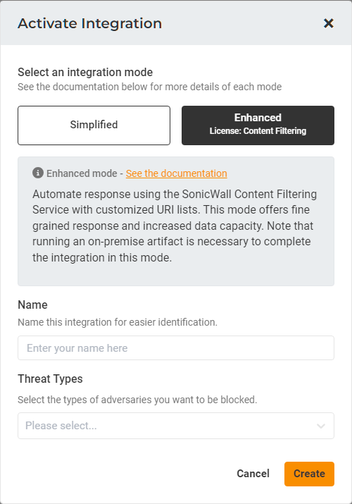 4. To activate the integration, you need to select one of the two Integration modes. The one that corresponds to SonicWall Firewall with Content Filtering license is the Enhanced one. Add a description and select the threat types you want to include.