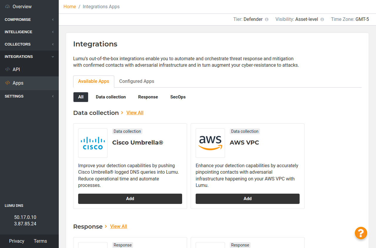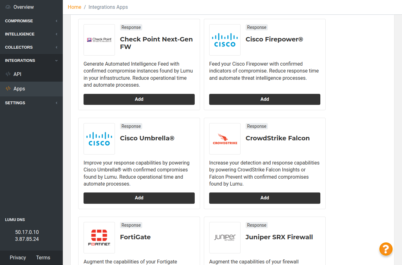 1. Log in to you Lumu account through the Lumu Portal and navigate to the integrations screen.