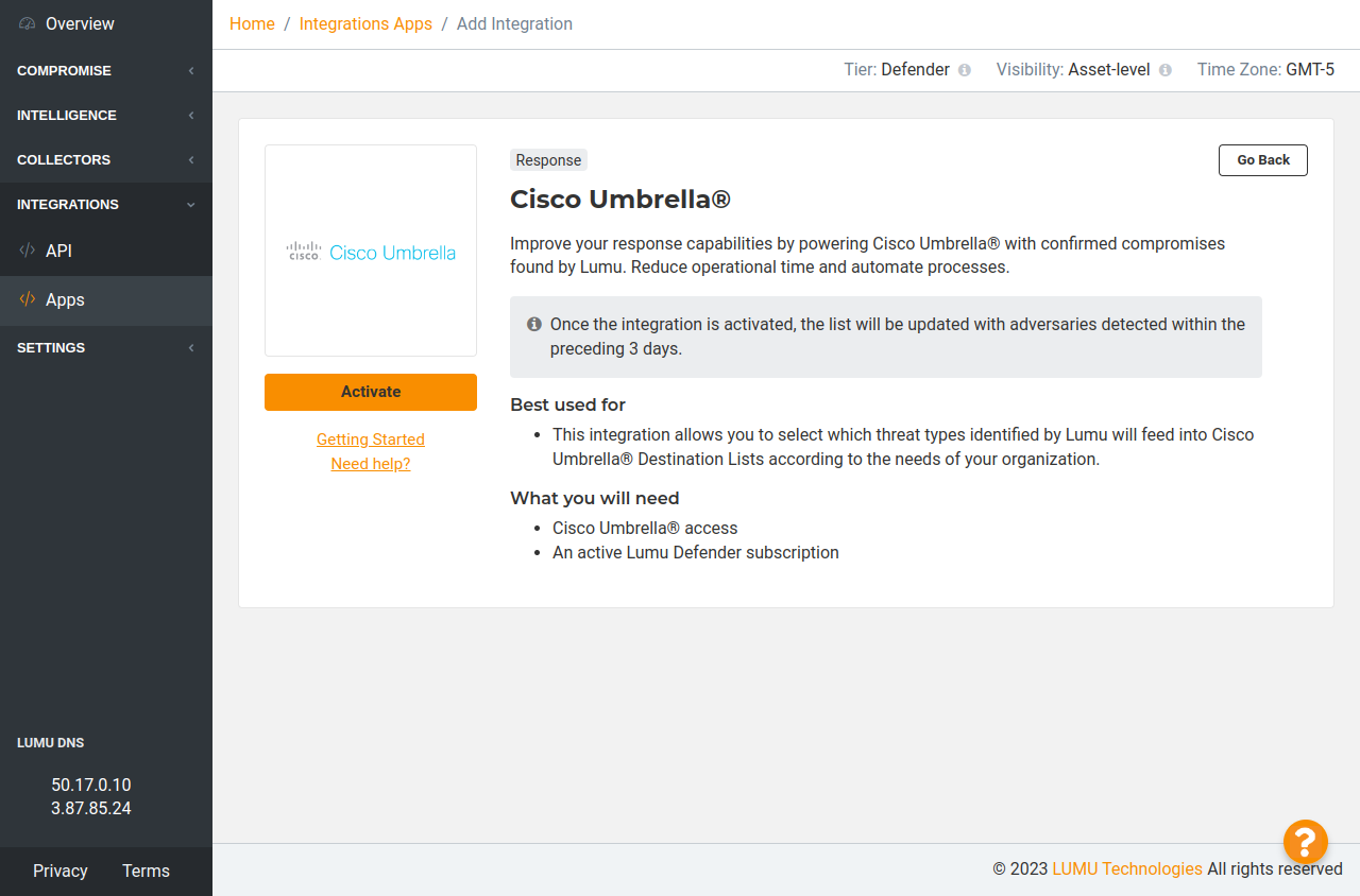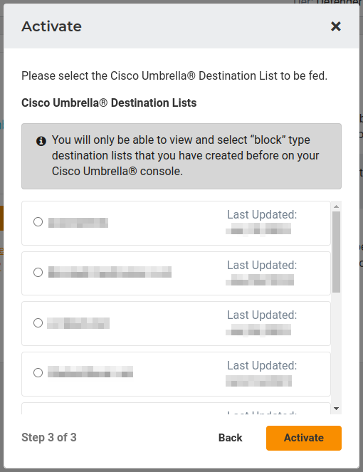Once the integration is activated, the Destination List will be updated with confirmed compromises found by Lumu within the preceding 30 days.