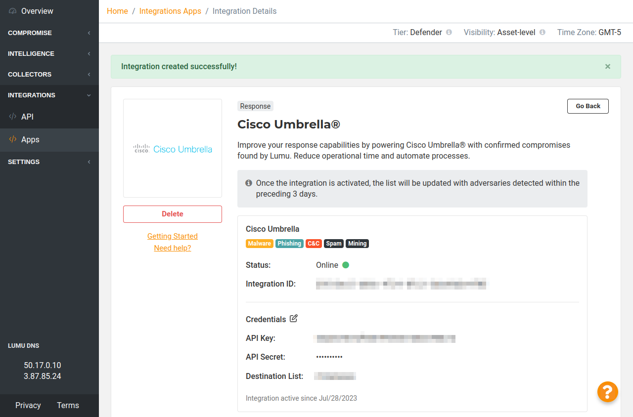The integration is now created and active. Now, the Lumu Portal will display the details of the created integration: