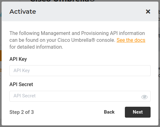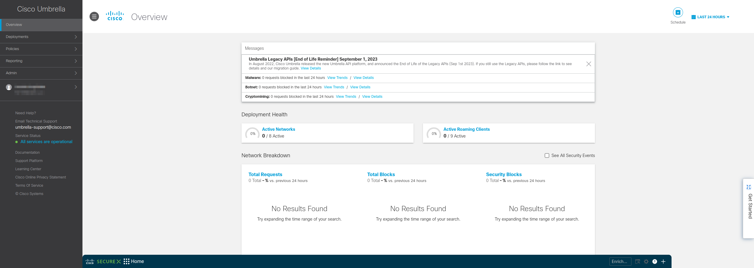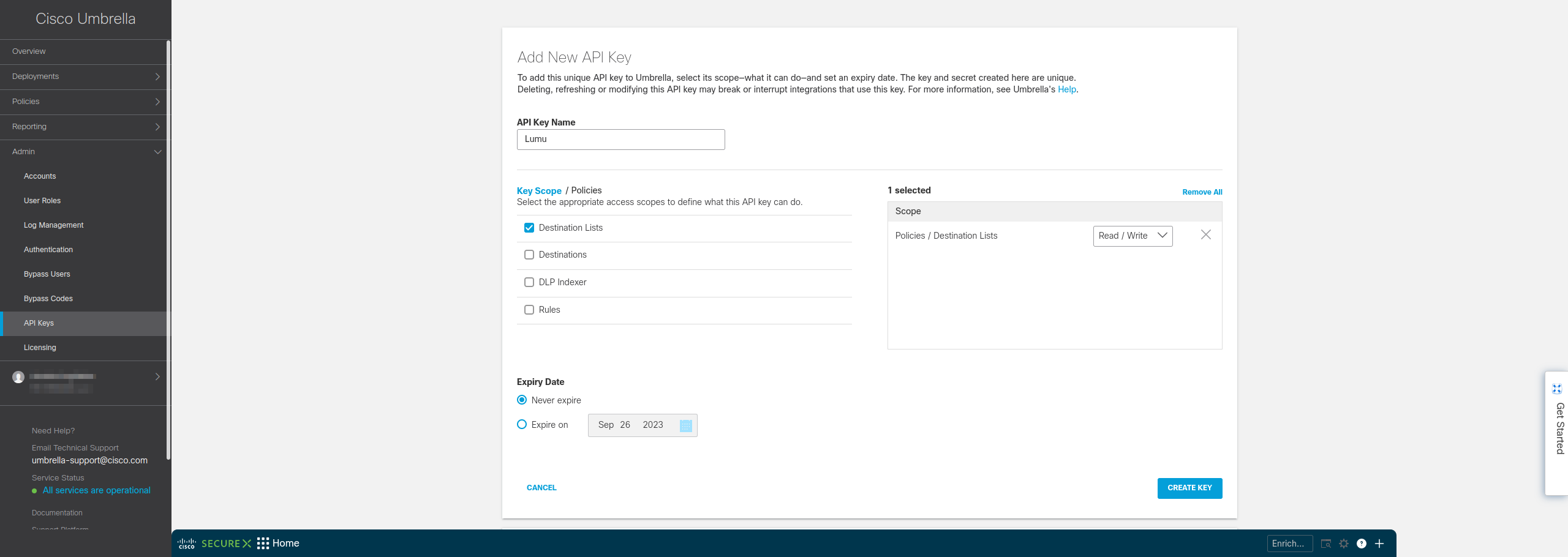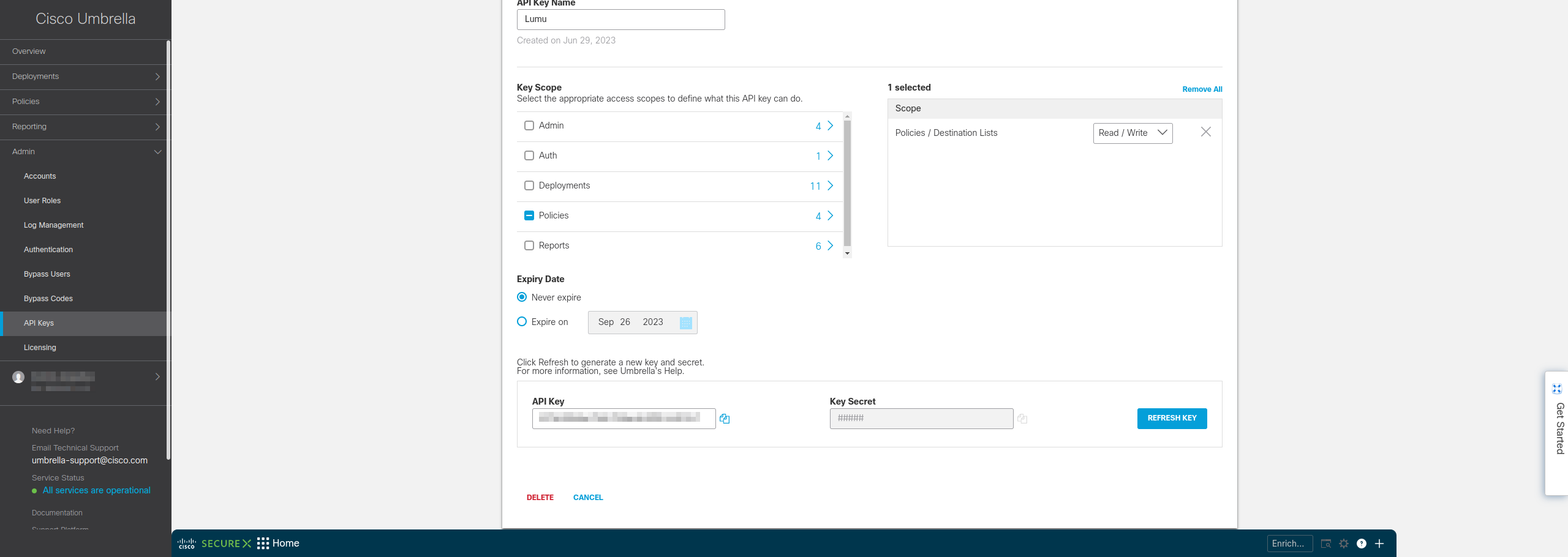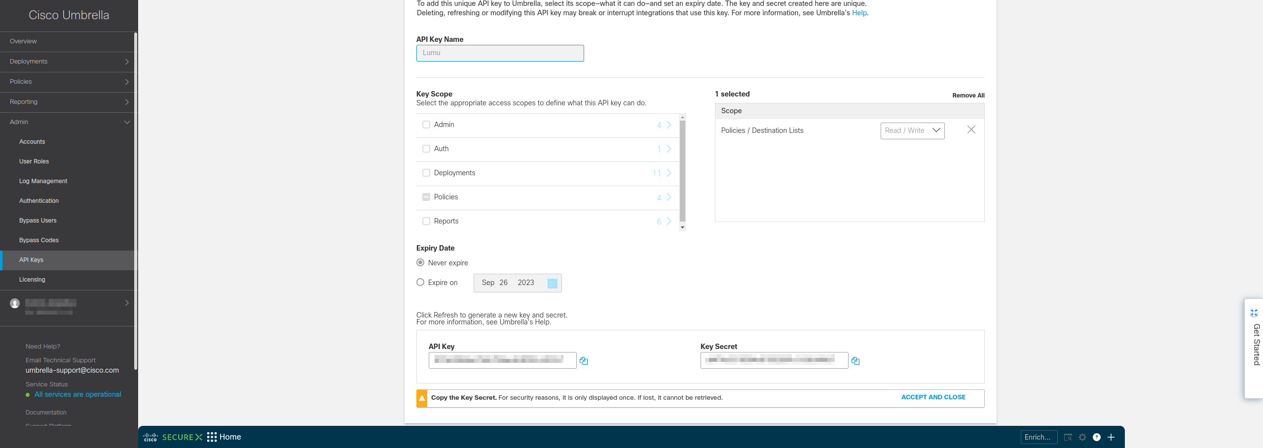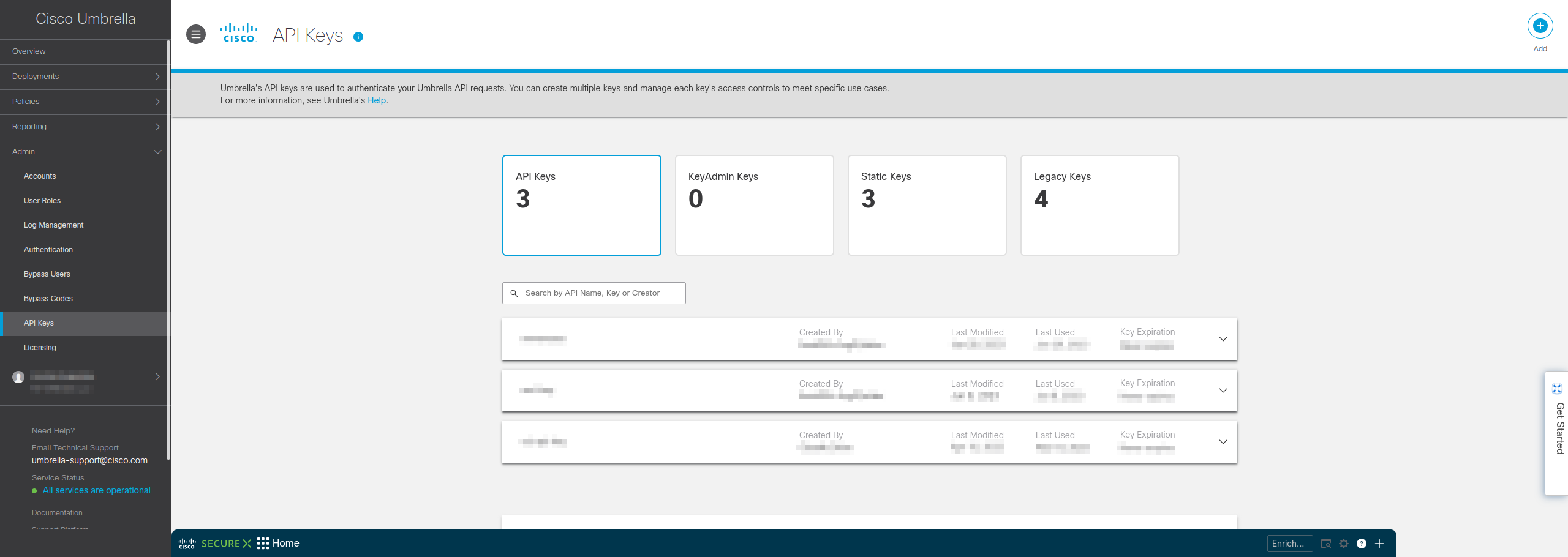 To interact with any of the Umbrella APIs, create an API Key in the Cisco Umbrella portal and use the credentials to obtain an access token for making requests. To do so, follow the steps bellow:
