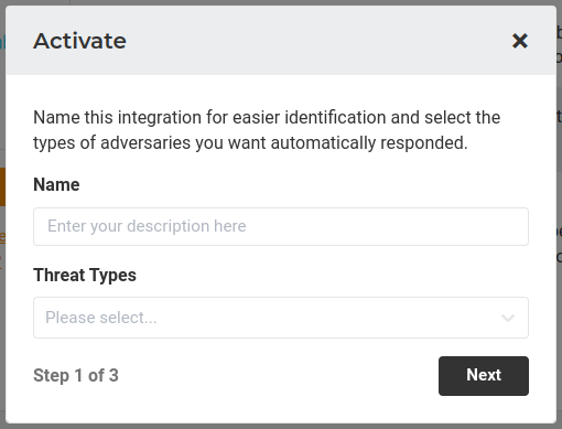 4. To activate integration, add a Name and select the Threat Types you want to be pushed to your Destination List. Click Next.