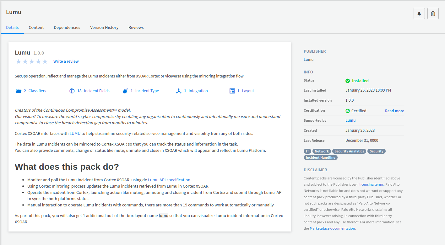 The Palo Alto Cortex XSOAR Out-of-the-box SecOps integration with the Lumu Content Pack for Cortex XSOAR allows you to operate all of your Lumu detections as Cortex incidents. After installing and configuring a new instance of the Lumu Content Pack for Cortex XSOAR, you will be able to operate on new and updated adversarial activity detected by Lumu using commands to close, mute, unmute, comment, and collect context-detailed information. All the operation of Lumu incidents within Cortex will be reflected in your Lumu portal and vice versa.