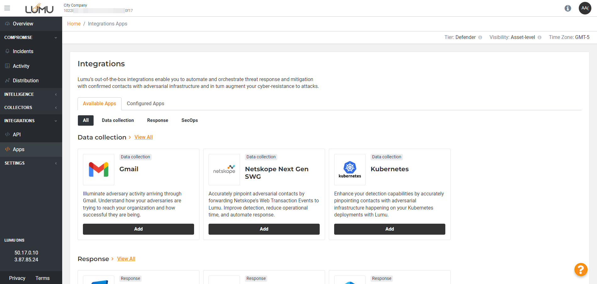 1. Log in to your Lumu account through the Lumu Portal and navigate to the integrations screen.