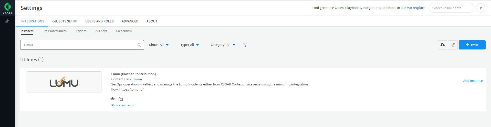 2. After the Lumu Content Pack for Cortex XSOAR is installed, go to the Settings menu using the left navigation bar. Under the Integrations tab, go to the Instances tab. Search for Lumu, and add a new instance.