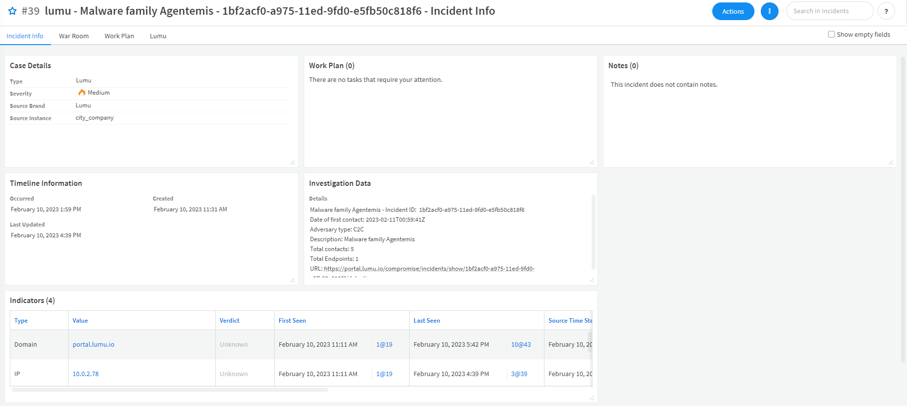 After setting up the Lumu Content pack, you can check Lumu incidents under the