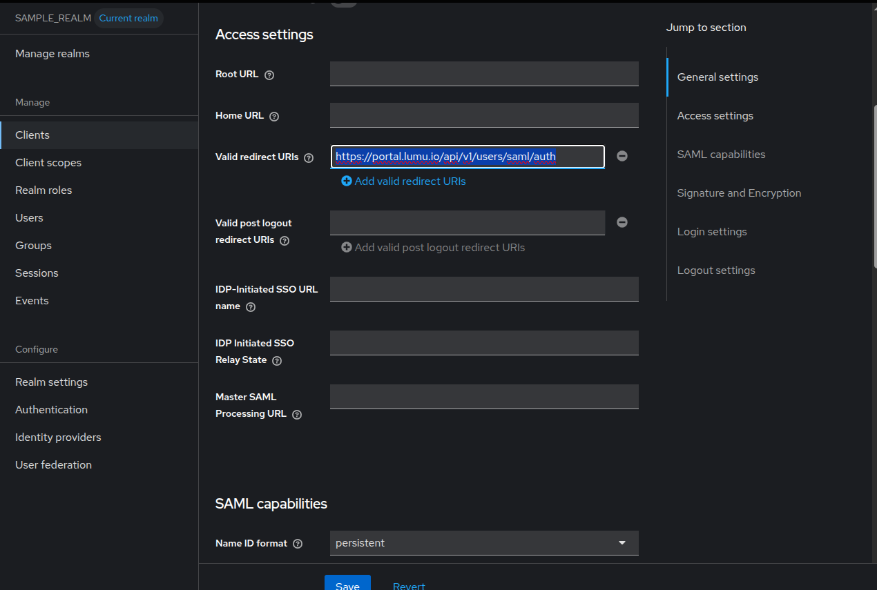 9. Finally, share the .xml file you saved in step 2 with Lumu Support. They will complete the setup and configuration on their end. Once the SSO implementation is complete, Lumu Portal users will be able to log in using Keycloak.