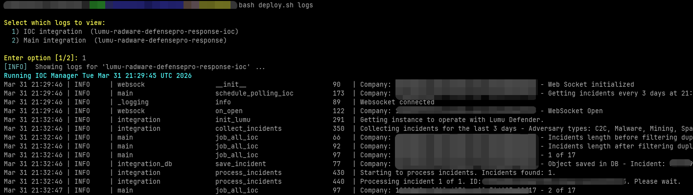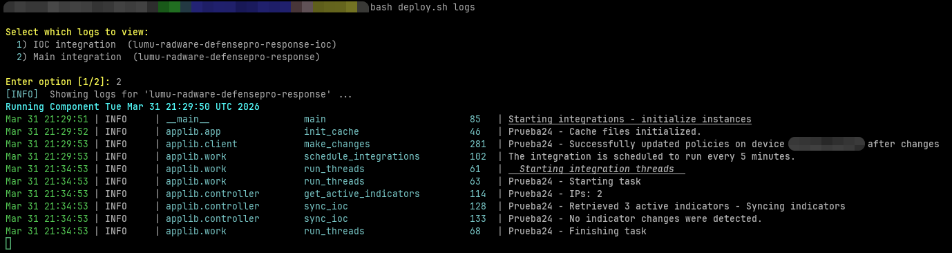 The logs option allows you to view the integration's logs. You will be prompted to choose between viewing the IOC logs or the main component logs; follow the guided steps.