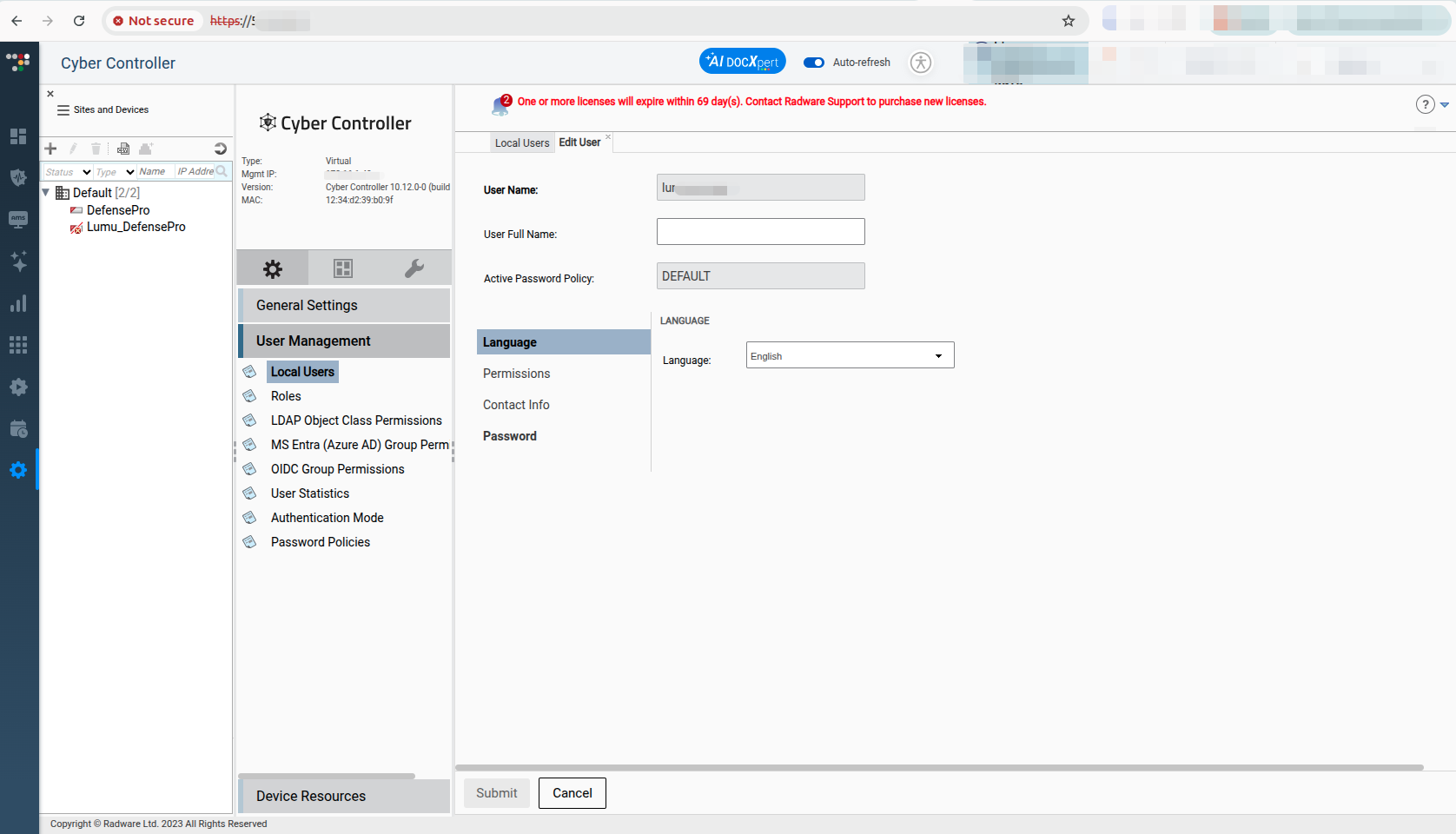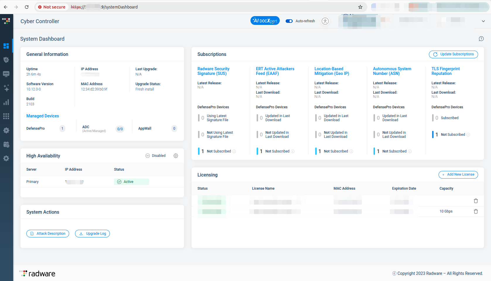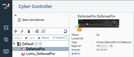 You must provide the integration with the IP address of the DefensePro appliance you want to integrate. From where you left off in the previous section, use the right navigation tree, identify your Radware appliance, and click on it. Extract the IP address labeled Mgmt IP.