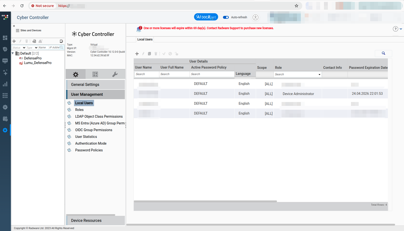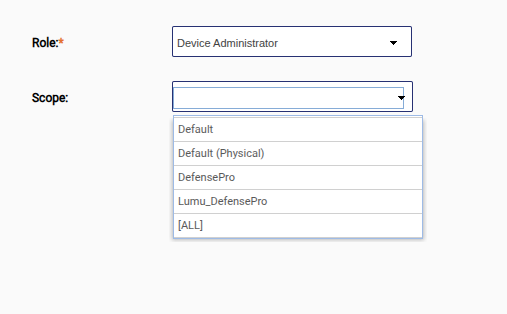 The user account created for this integration must have at least the Device Administrator role. This level of access is required to execute actions such as locking the configuration, applying updates, and managing the network table utilized by the component.