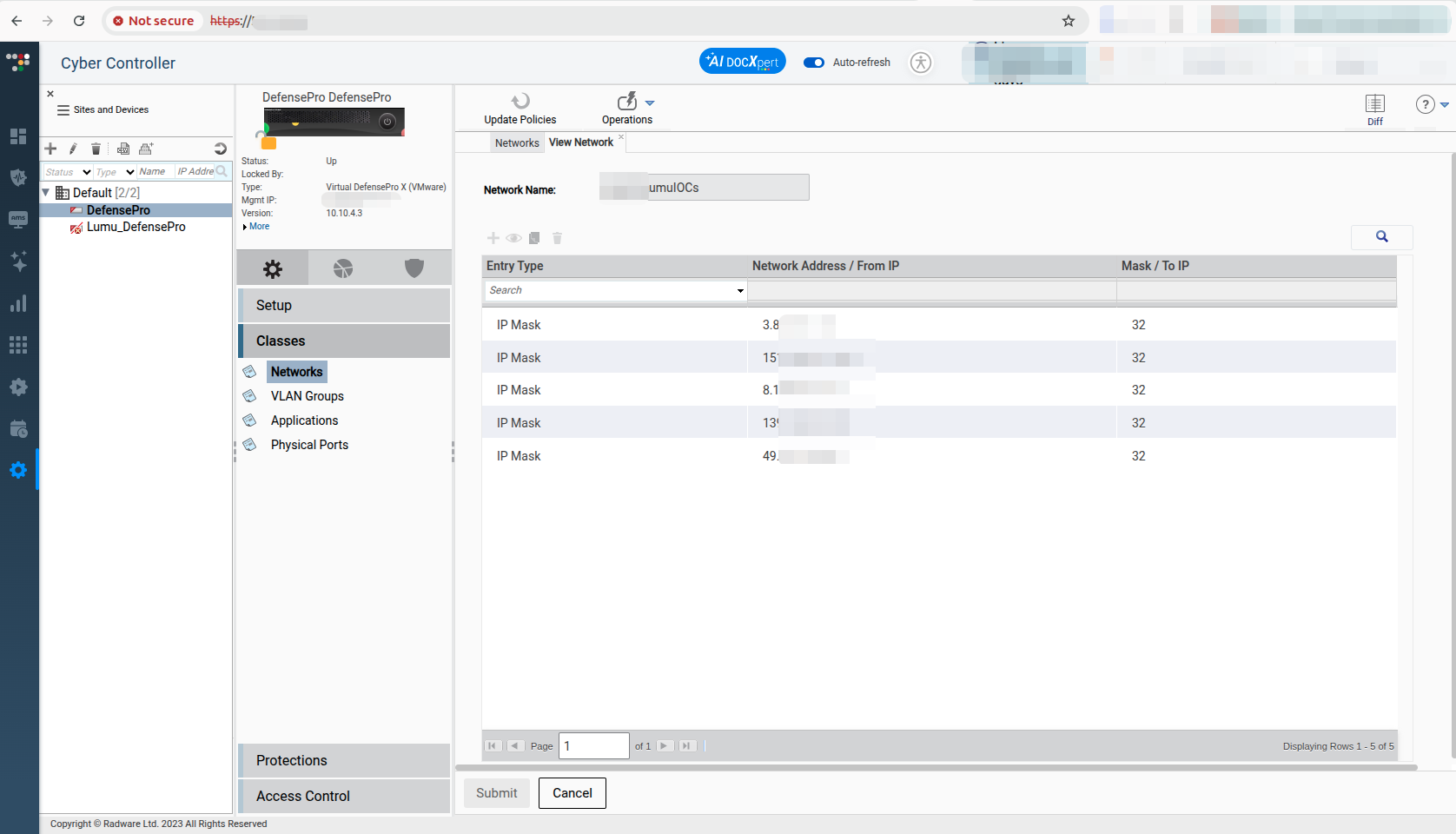 After the integration runs, any Indicators of Compromise (IoC) present in your instance will be visible in the Network class created by the integration. To verify the uploaded IOCs, log in to your Cyber Controller instance and navigate to the configuration menu. Select the DefensePro appliance. Then, go to the Classes -> Network menu. In the list of network classes, you will find a new entry named as the configured integration name ending in -LumuIOCs.
