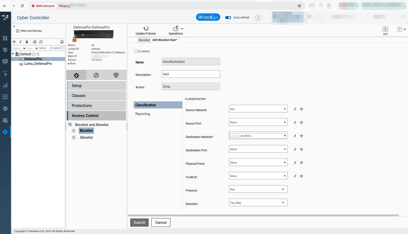 Lumu Custom Response integration with Radware DefensePro uses its API to manage the entries of a dedicated Network Entries by updating IP addresses related to Lumu detections. This Network Class can be referenced in blocklists to avoid further outbound contacts within your Radware DefensePro deployment.