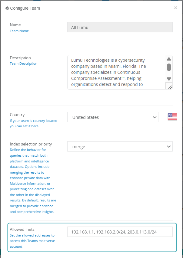 Once you save the changes, all members of your team will be subject to this restriction. This means that any team member trying to access Maltiverse from an IP address that is not listed in the Allowed Inets field will be denied access.