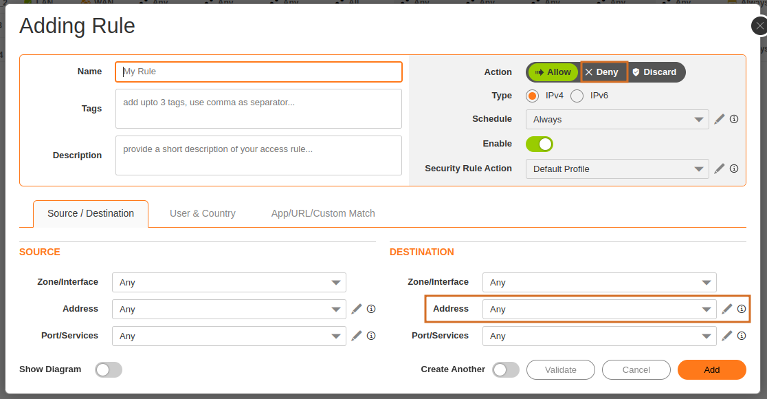 3. Select an Action, whether to Allow, Deny, or Discard access.