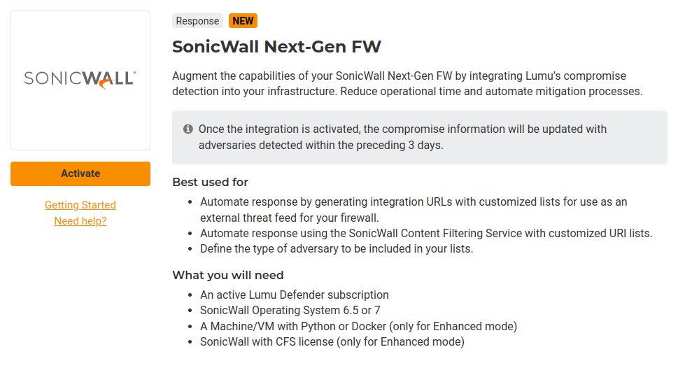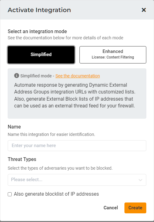 4. To activate the integration, you need to select one of the two Integration modes. The one that corresponds to SonicWall Firewall is the Simplified one. Add a description and select the threat types you want to include.
