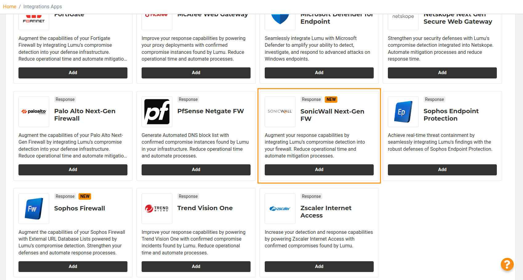 2. Locate the SonicWall Next-Gen FW integration in the available apps area and click to add, then click to view details.
