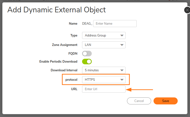 6. Select HTTPS from the Protocol drop-down list.7. Paste the Lumu list on the URL option.