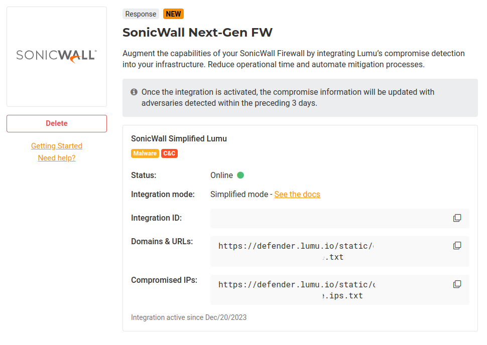 If you are working with SonicOS 6.5.4.5-53n or above, you need to change the scheme of the Lumu URL to http before pasting it. For detailed information, read the SonicWall Community - DEAG Implementation forum.