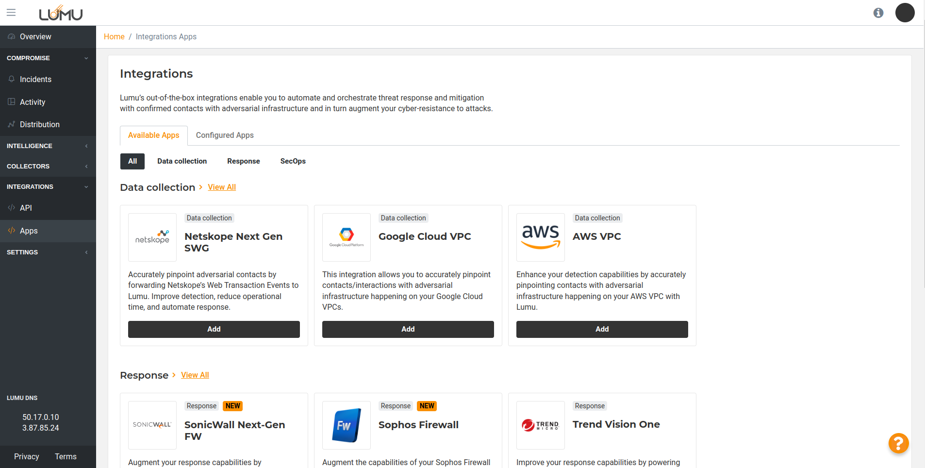 1. Log in to your Lumu account through the Lumu Portal and navigate to the integrations screen.