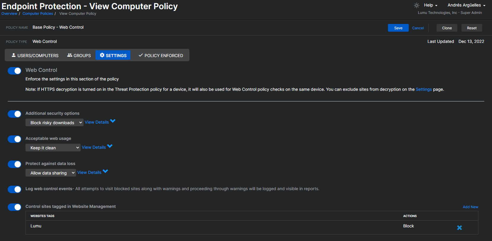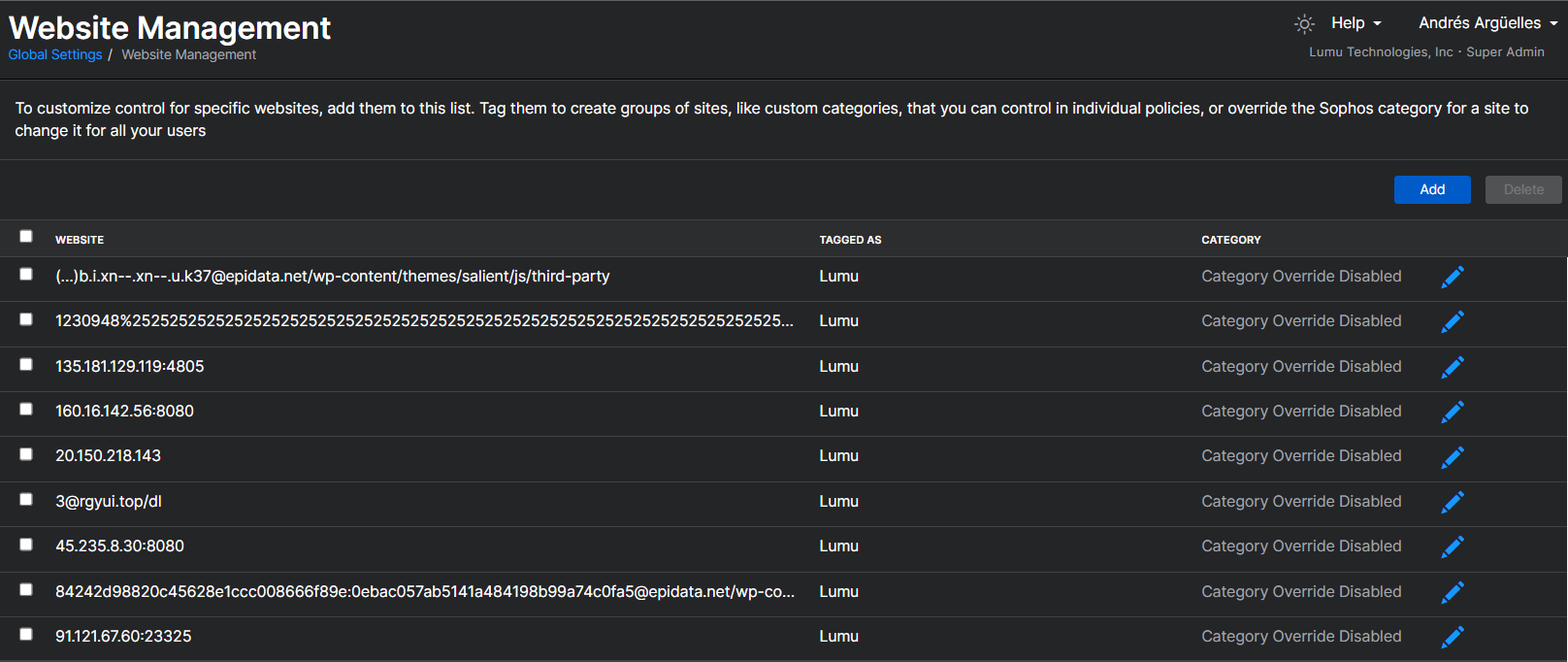 If you are working with URLs, configure your Sophos policies to block navigation to the tag Lumu . To do so, follow these steps in your Sophos Central Web console.