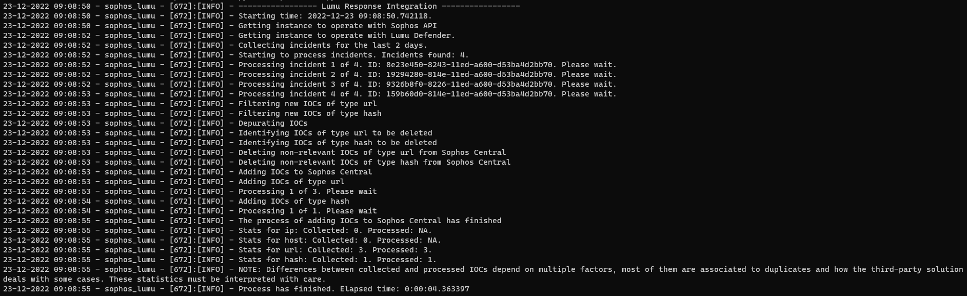 Use the following command to fetch and push to your Sophos Central Web console URLs and hashes related to incidents found in your organization by Lumu in the last 30 days: