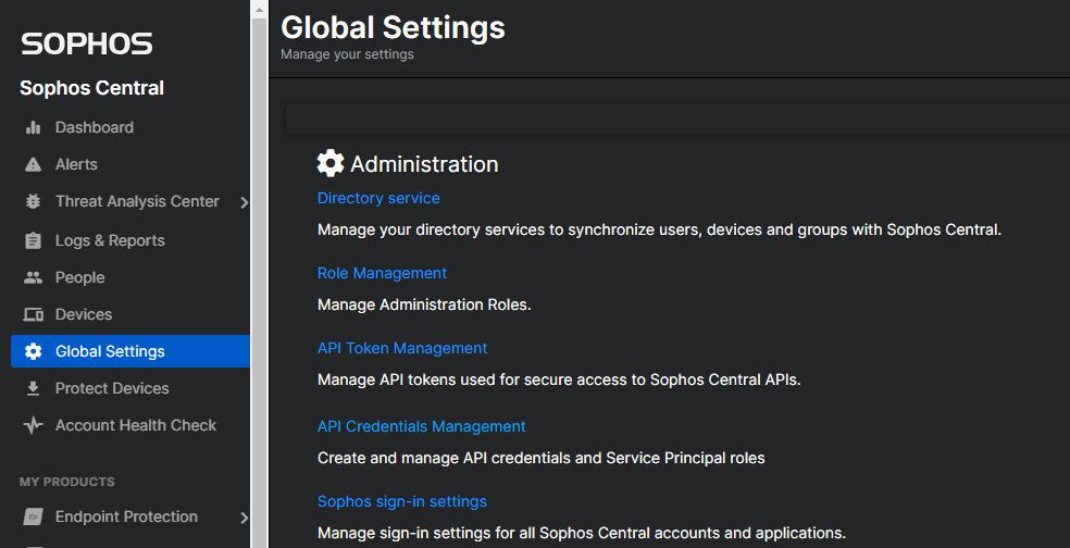 Using a global administrator user in your Sophos Central console, follow these steps: