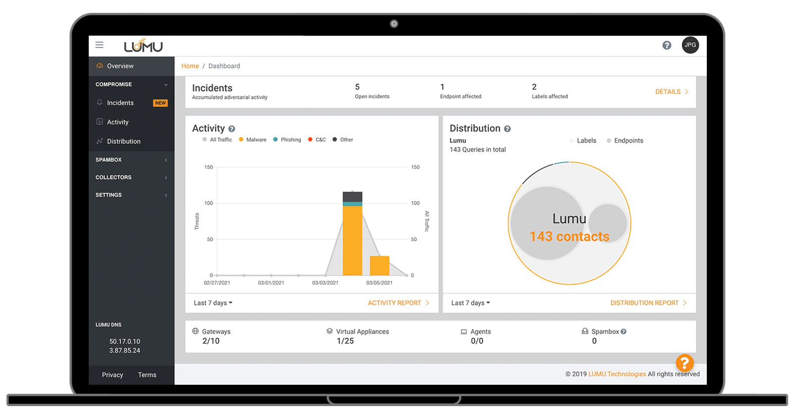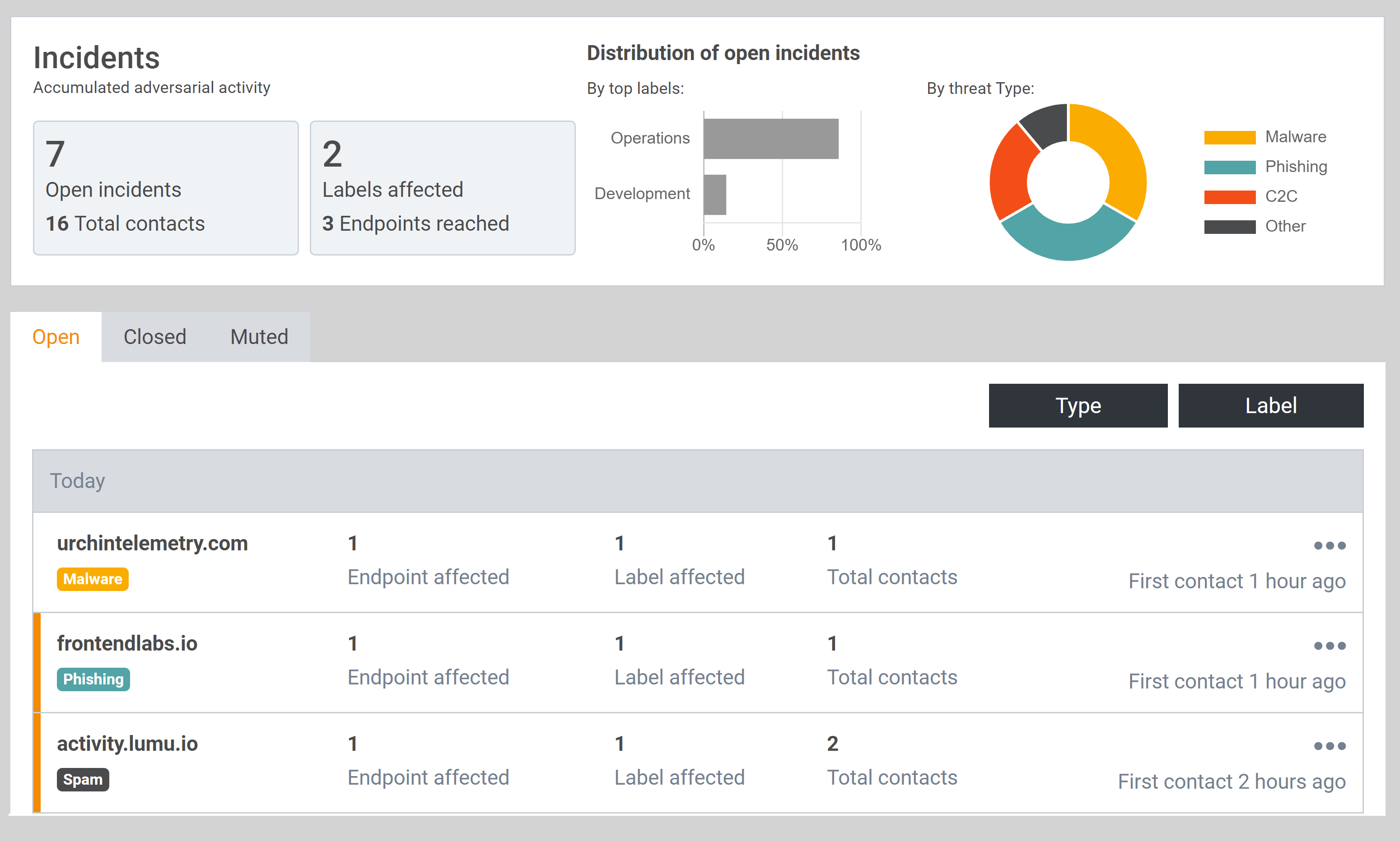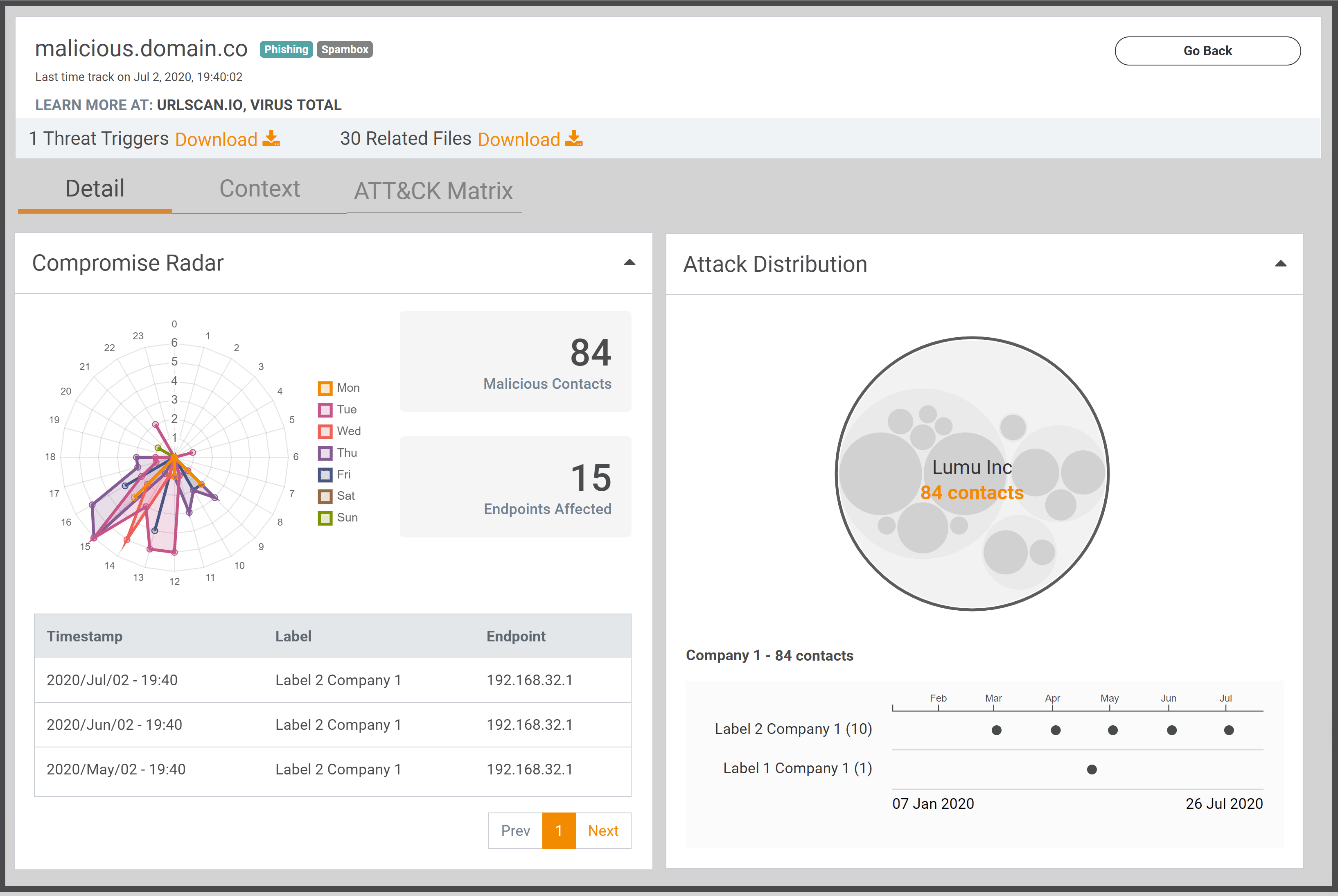 All your incidents and compromise activity in an easy-to-read dashboard with details on the activity and distribution of the Indicators of Compromise (IoC) that Lumu identified in your organization.