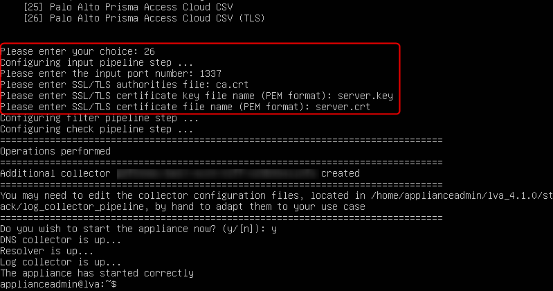 Enter the number of the option corresponding to the TLS version of the technology you want to collect data from, then input the following data as it is requested by the VA: