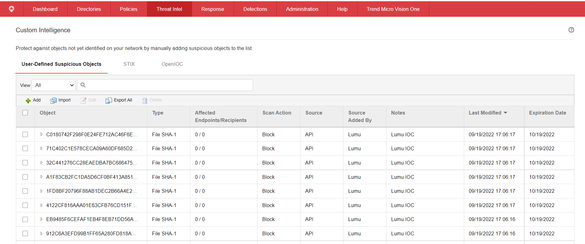 The integration creates new User-Defined Suspicious Objects in the Threat Intel > Custom Intelligence module.