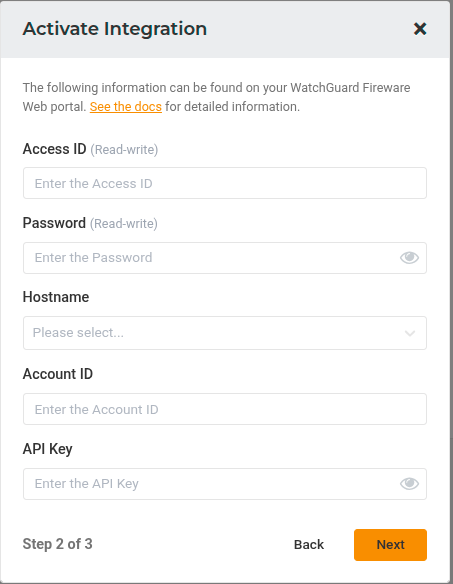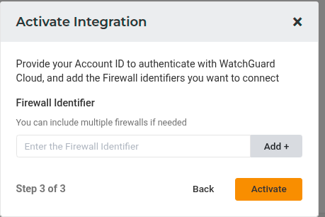 6. Add the Integration Firewall Identifier. Enter the Firewall identifier retrieved from the Collect the Firebox Firewall ID step.