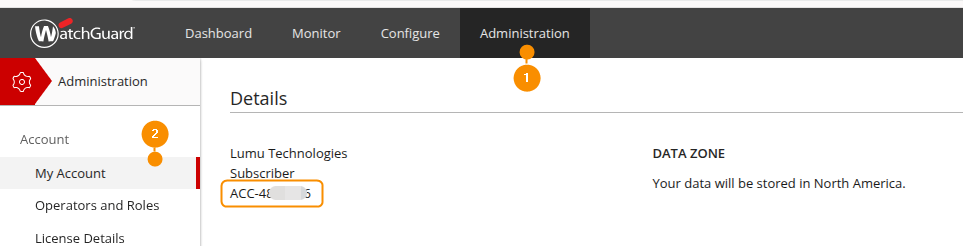 Go to Administration (1), then select My Account (2). Copy and save the Account ID string for the integration configuration process.