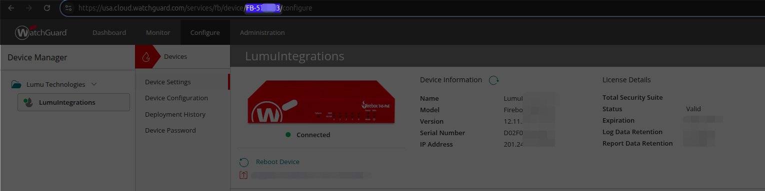 Each Firebox Firewall integration requires a Firewall ID, not the Serial Number. To obtain it, go to the Configure>Devices and select the device. Then, go to Device Settings and extract the string representing the Firewall ID from the browser's URL input section.