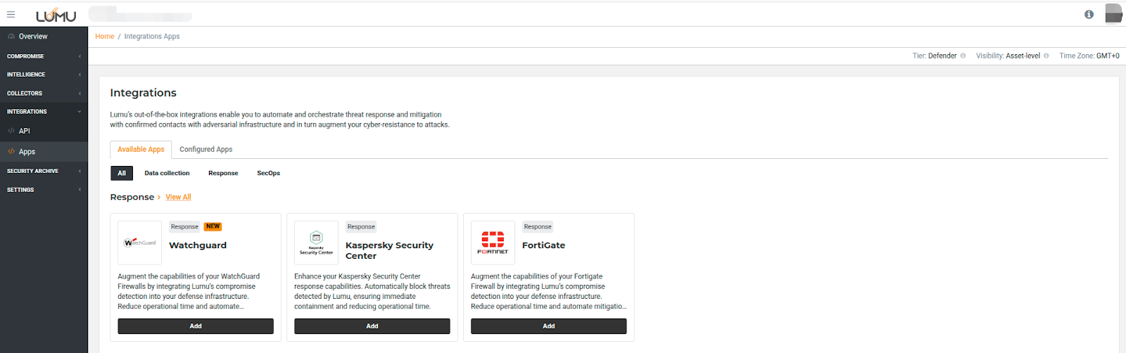 1. In the Lumu Portal, head to the panel on the left and open the Integrations drop-down menu. Then, click on Apps. Click on the Response tab on the right to filter the available integrations accordingly.