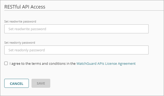 2. Set the readwrite and readonly passwords to use as your API access credentials and agree to the terms and conditions. When finished, click Save.