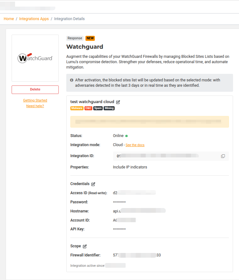 7. The integration is now created and active. The Lumu Portal will display the details of the created integration.