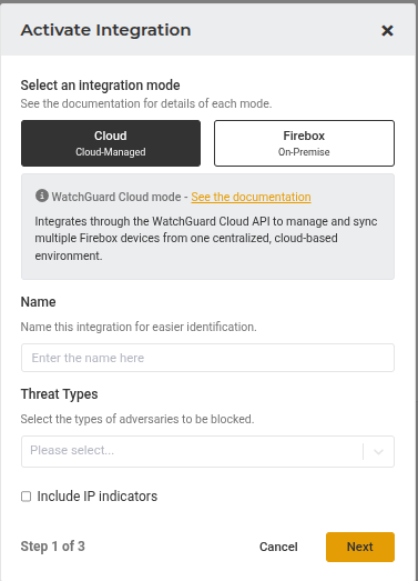 4. Select the Cloud in the Activate Integration window. Then, give the integration a distinctive Name, select the Threat Types you want to include, and if it applies, select the Include IP indicators toggle. When done, click Next.