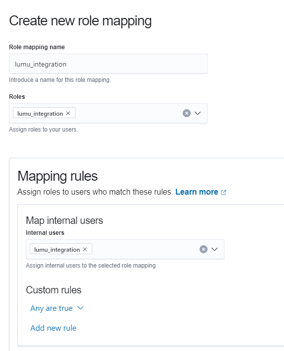3. Fill in the information in the Create new role mapping window. Make sure you select the lumu_integration role under the Roles field. Under the Internal users field, select the internal user created before.