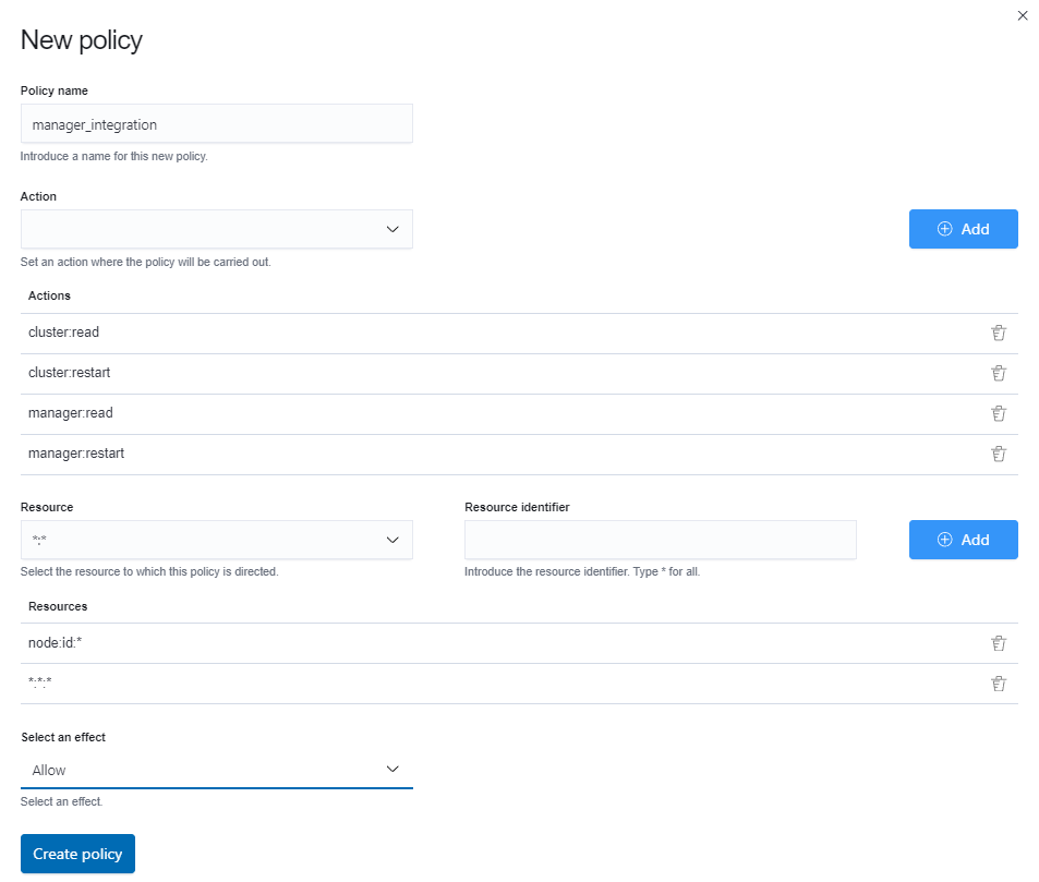 Action Resources cluster:read node:id:* cluster:restart node:id:* manager:read *:*:* manager:restart *:*:*