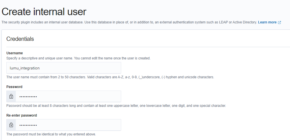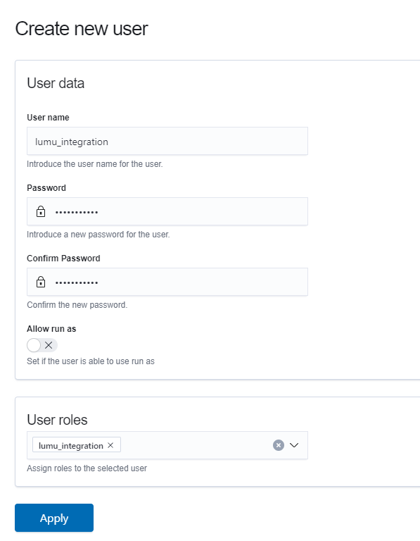2. Fill in the data for your new user. Make sure you assign the lumu_integration role created before.